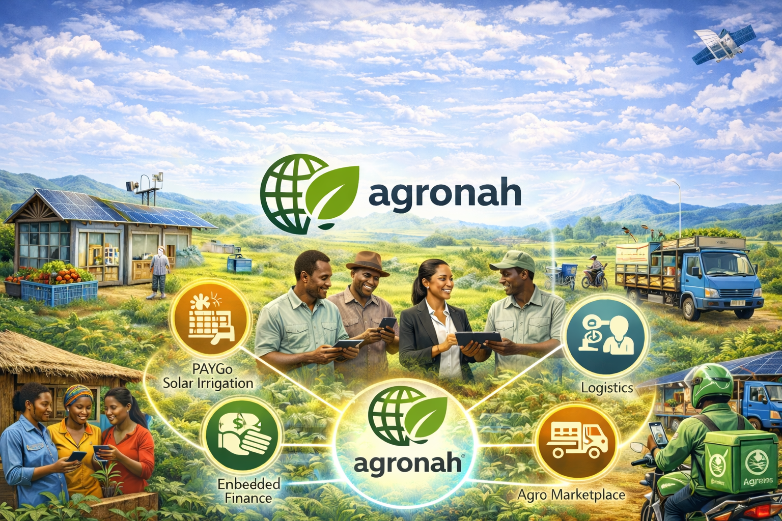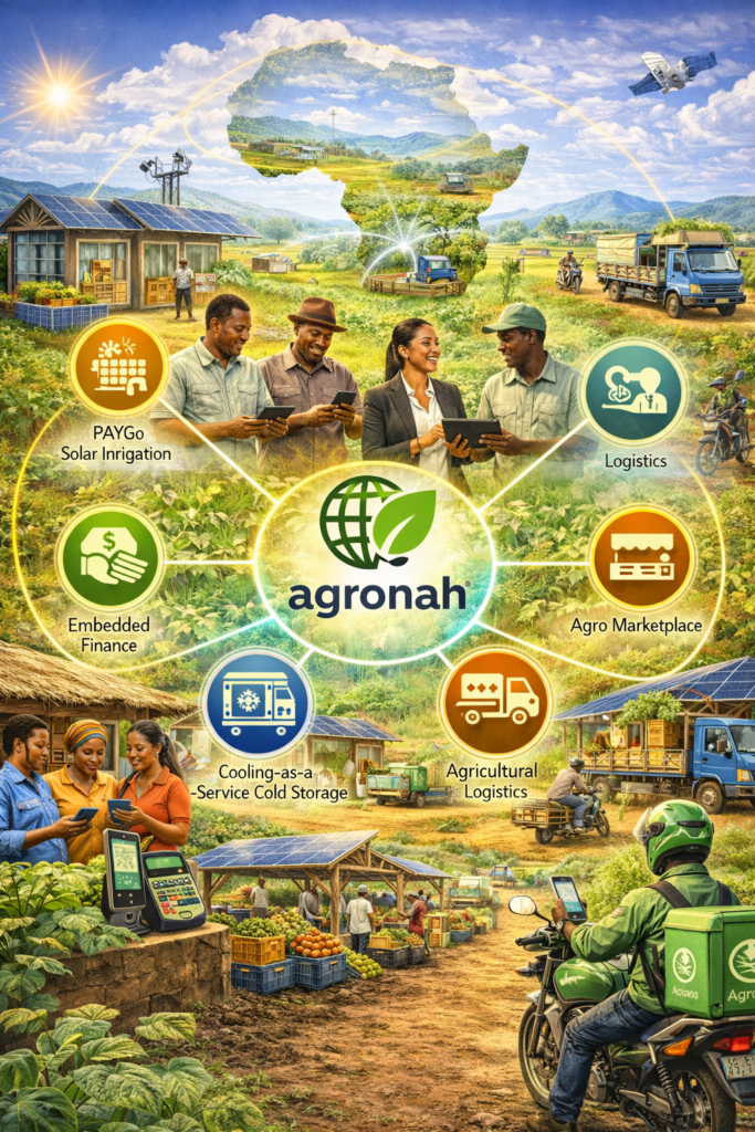 Agronah is a smart agriculture and agribusiness platform that unites farmers, cooperatives, agribusinesses, service providers, buyers, governments, and donors in one coordinated system. It brings together digital farm records, AI diagnostics, secure payments, PAYGo solar irrigation, and solar-powered cold storage to cover all critical needs of modern smallholders.